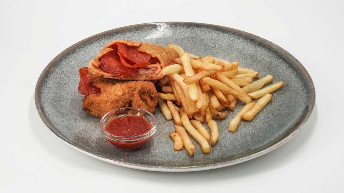 Kačkavalj, burger sos, pomfrit, krastaac, paradajz salata