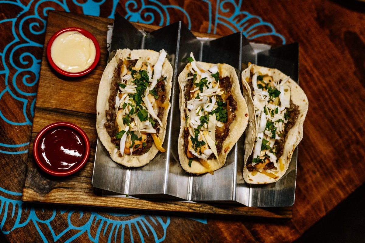 3 kom (svinjska plećka, pileći batak ili teletina po izboru), čedar, mocarela, crveni luk, peršun. Svinjski taco sadrži narandžu i suvu papriku u sosu!