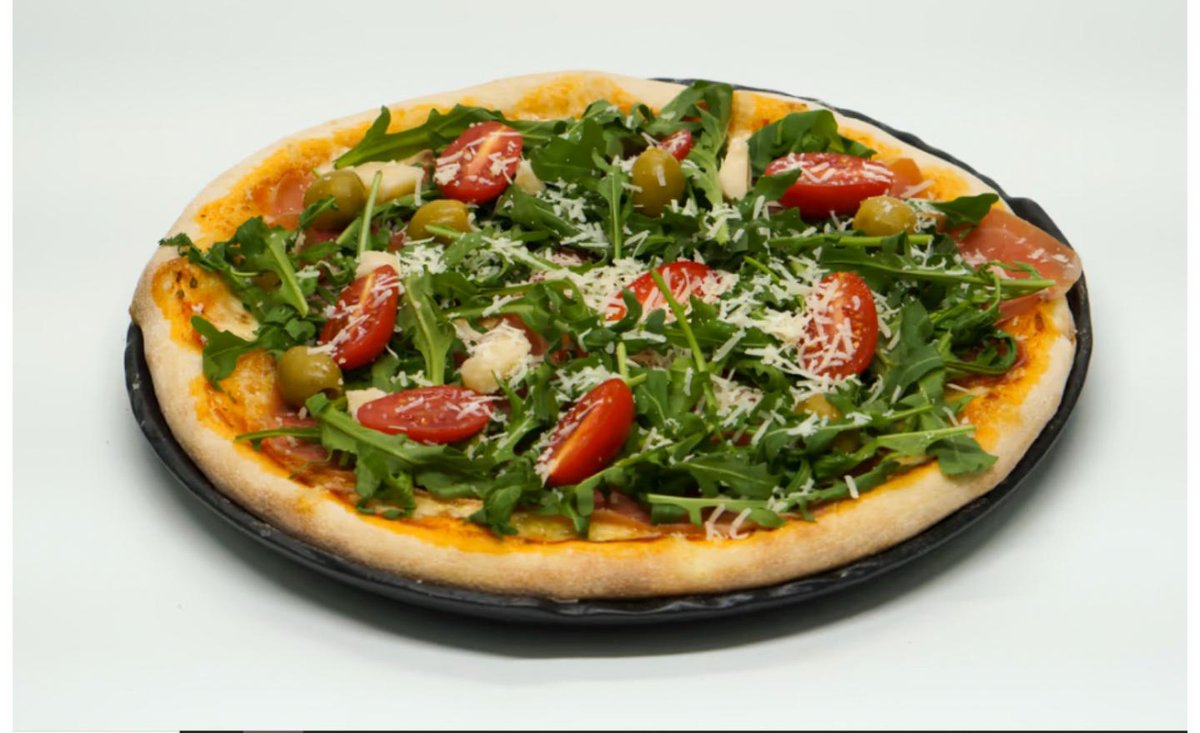 Pizza sa testom, pelatom, pršutom, kačkavaljem, mozzarellom, parmezanom, maslinama i rukolom