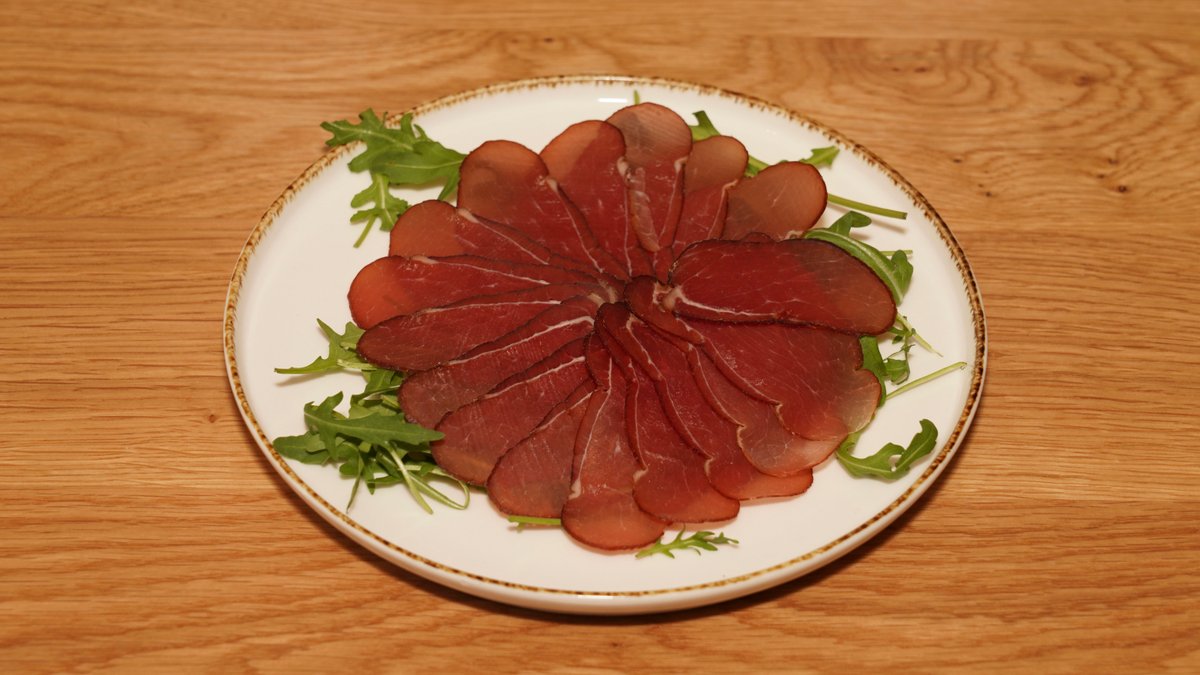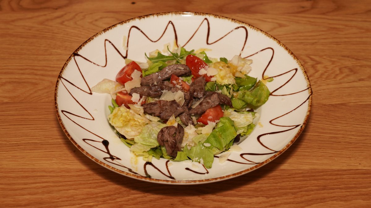 Laks kare 240g, pršuta 30g, gauda 30g, pomfrit 100g i vitaminska salata 50g