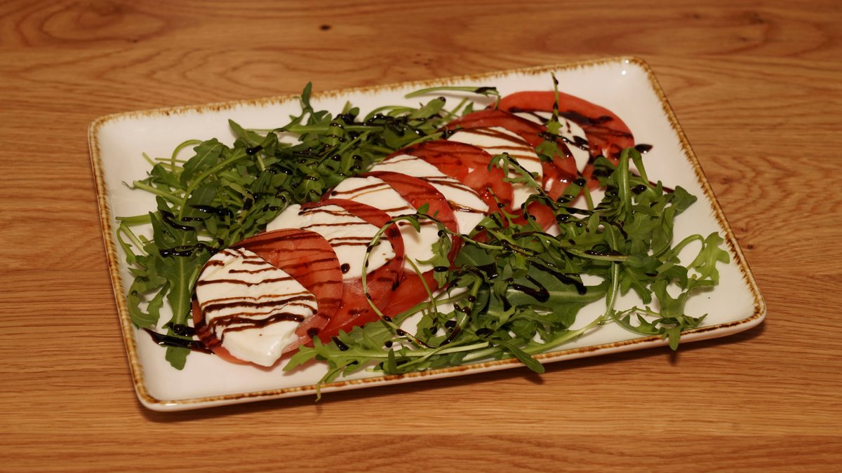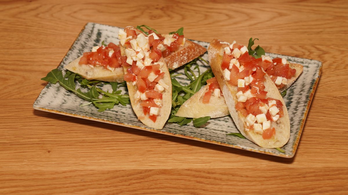 Četiri zapečene kriške bageta sa mariniranim paradajzom, mozzarellom i rukolom