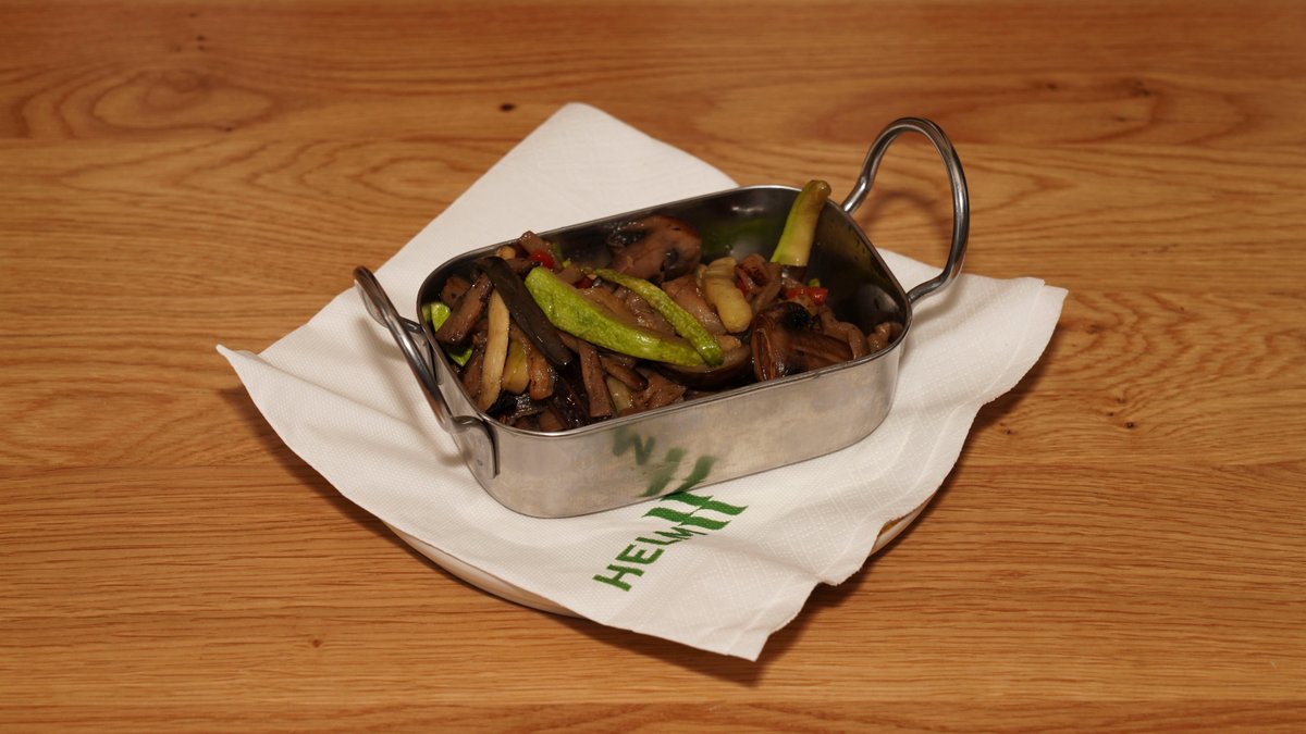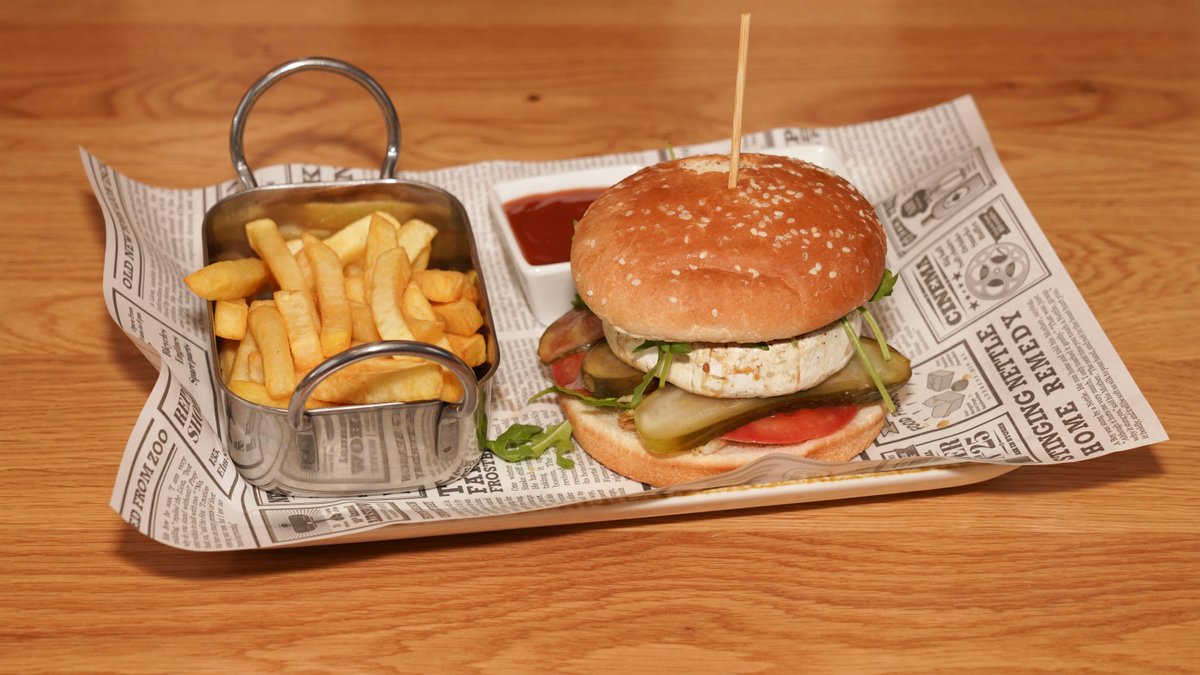 Vege lepinja sa osnovom od graška, vege burger sosom, kiselim krastavčićima, karamelizovanim lukom i pomfritom