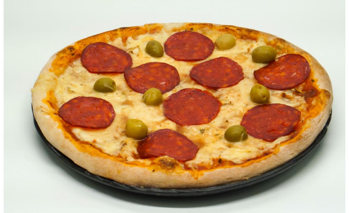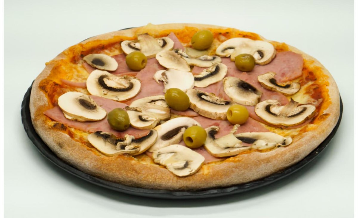 Pizza sa testom, pelatom, šunkom, kačkavaljem, pečurkama i maslinama