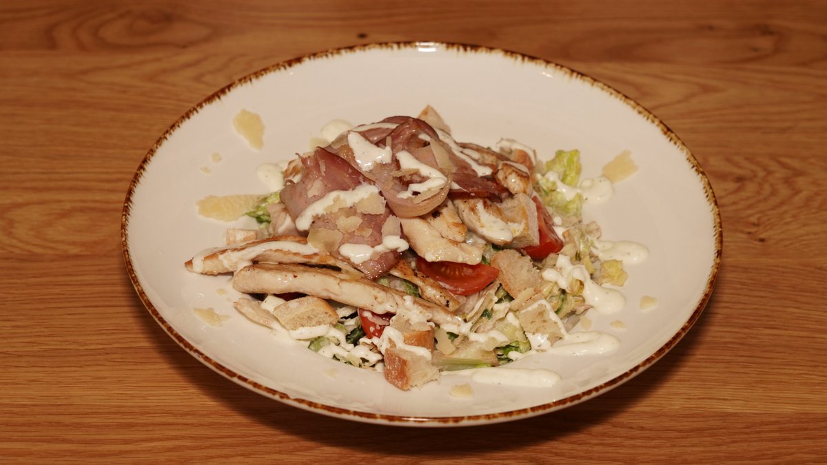 Mix zelene salate sa piletinom, slaninom, krutonima i parmezanom sa jogurt dressingom