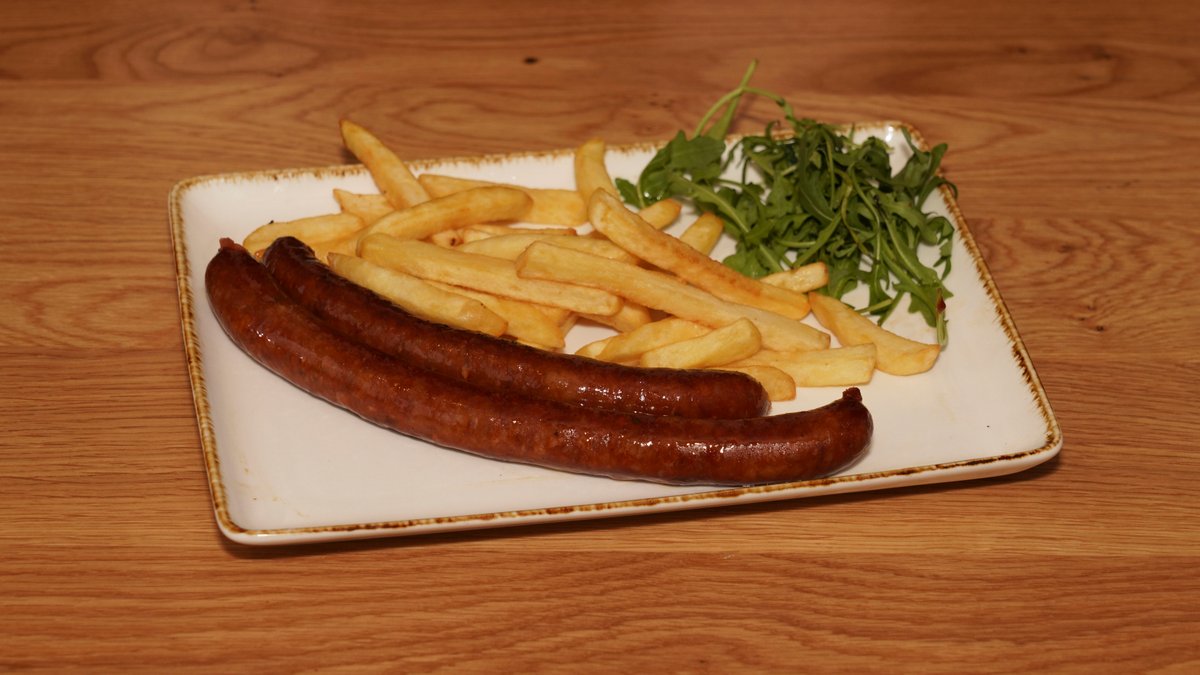 Kobasica 200g sa pomfritom 100g i prilogom kečap i majonez