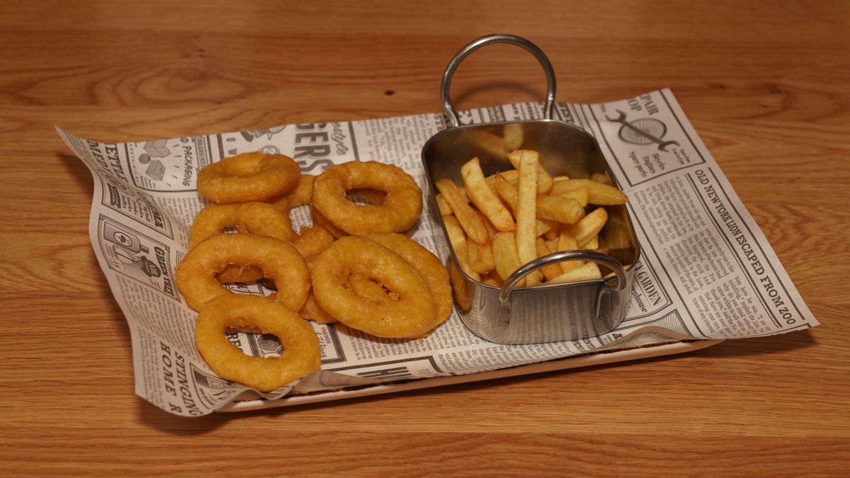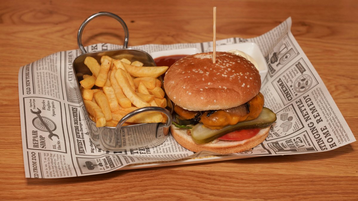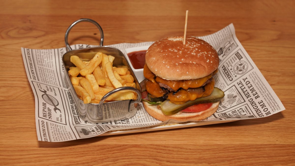 Dva pljeskavice od junetine u burger lepinji sa čedar sirom, burger sosom, zelenom salatom, paradajzom, kiselim krastavčićima, karamelizovanim lukom i pomfritom