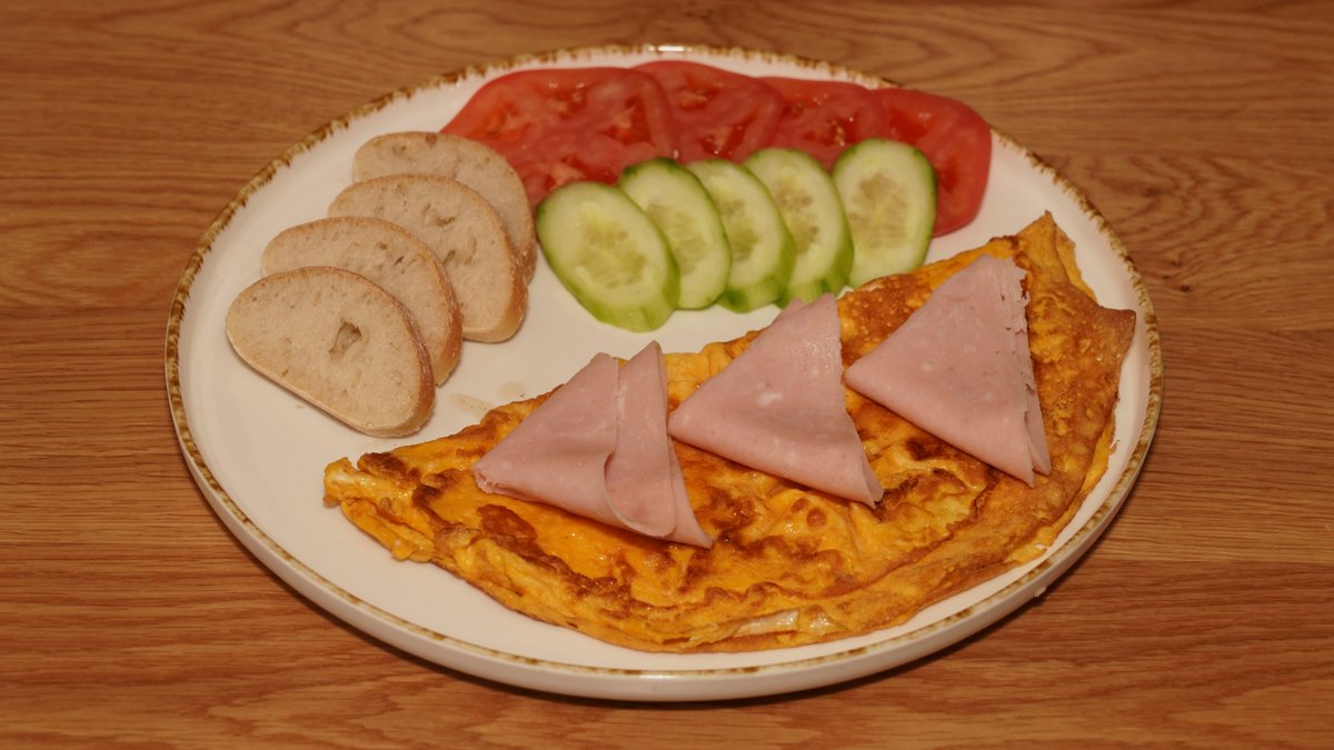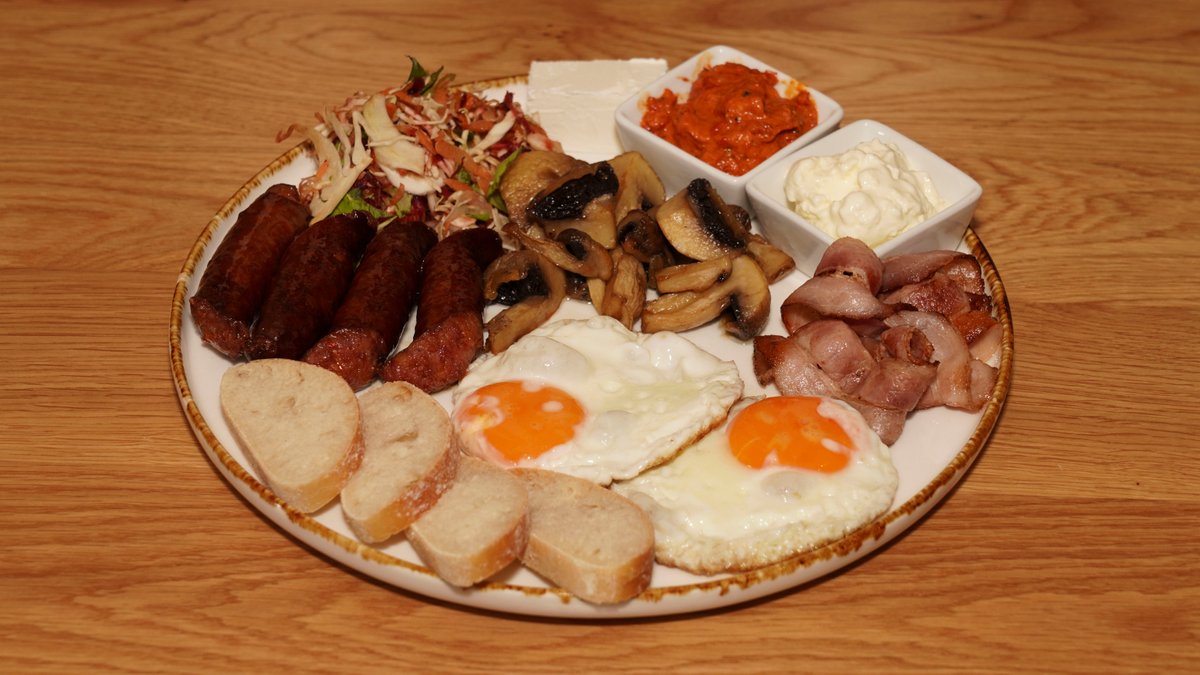 Dva jaja, kobasica, slanina, ajvar, pečurke, sir, kajmak, salata i hleb