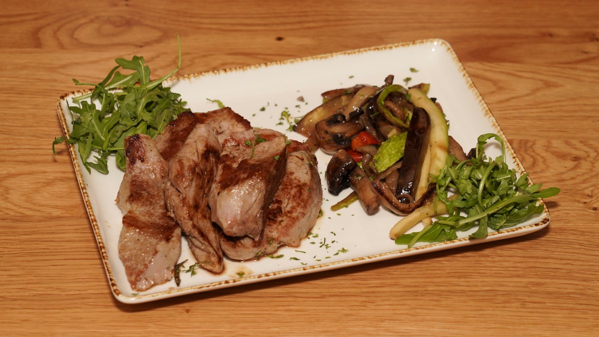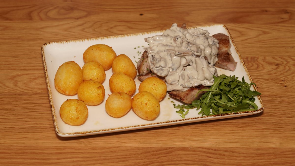 Svinjski file 300g sa sosom od pečuraka 125g i kuvanim krompirom 125g