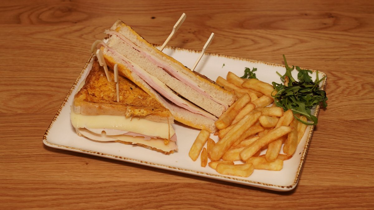Tost hleb sa majonezom, senfom, šunkom, ćurećim prsima, gaudom i prilogom pomfrit
