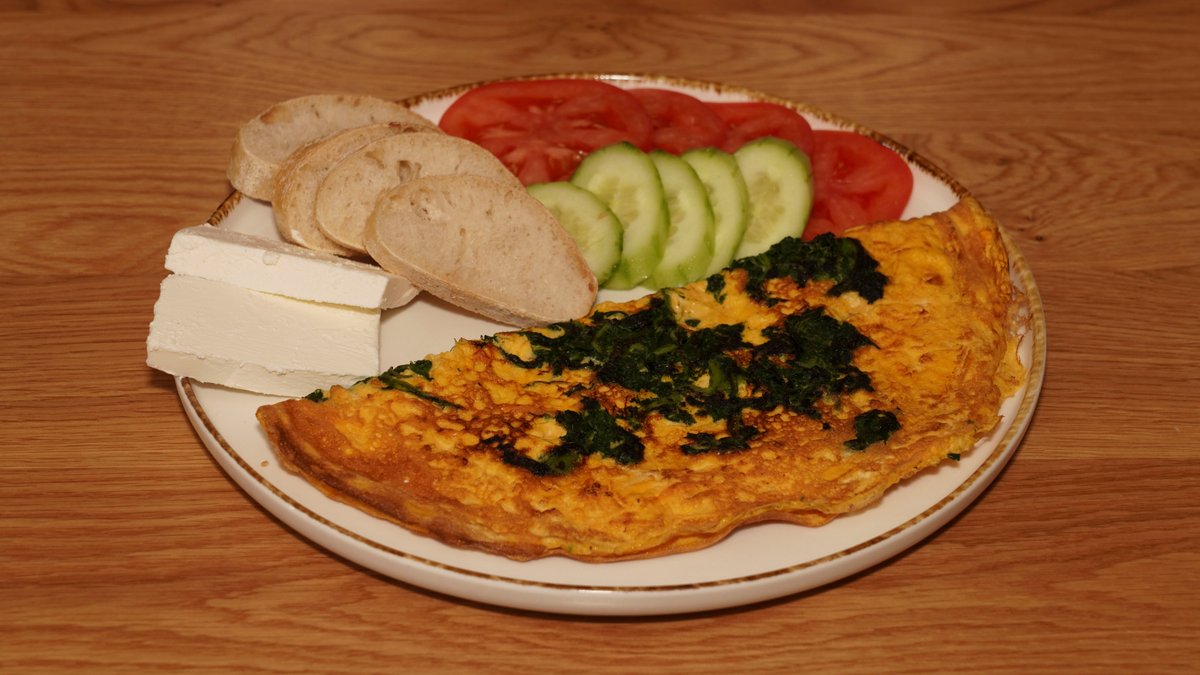 Tri jaja sa sirom i spanaćem, uz salatu i hleb
