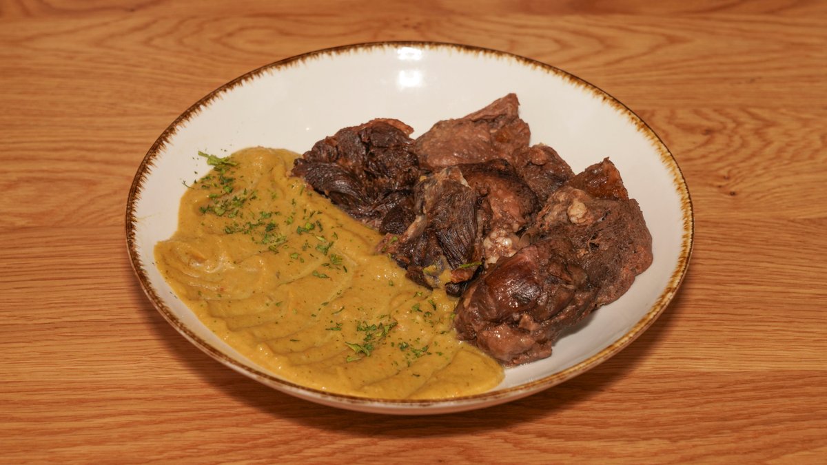 Teleći ribić u sosu od crnog vina sa povrćem 350g i pire krompirom 150g