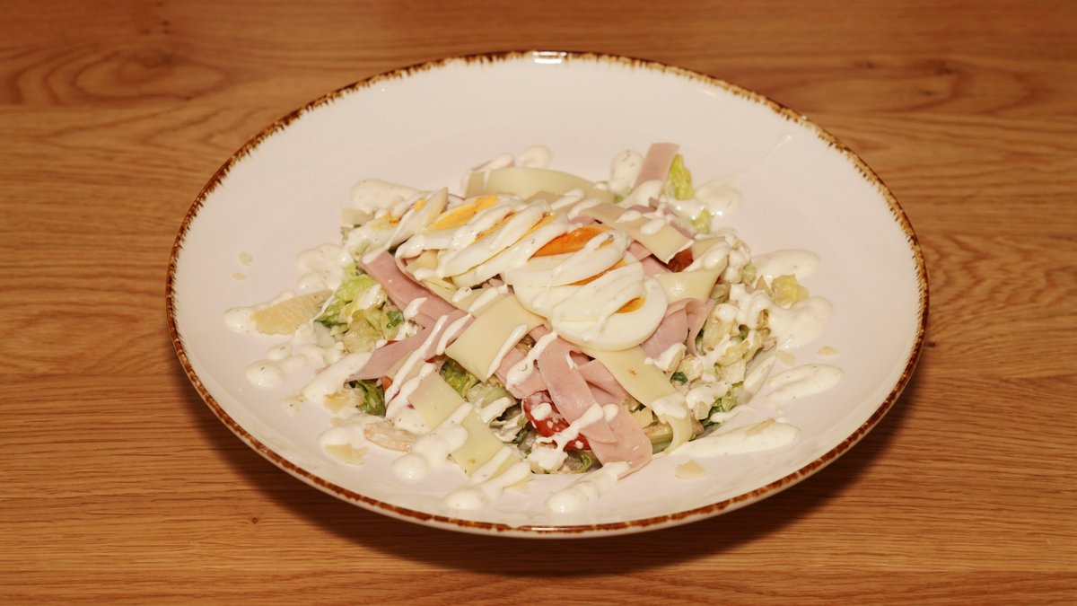 Mix zelene salate, čeri paradajz, šunka, gauda, kuvano jaje i jogurt dressing