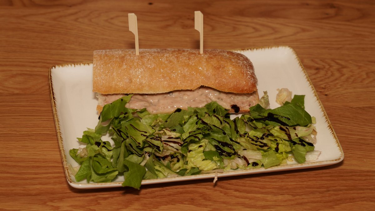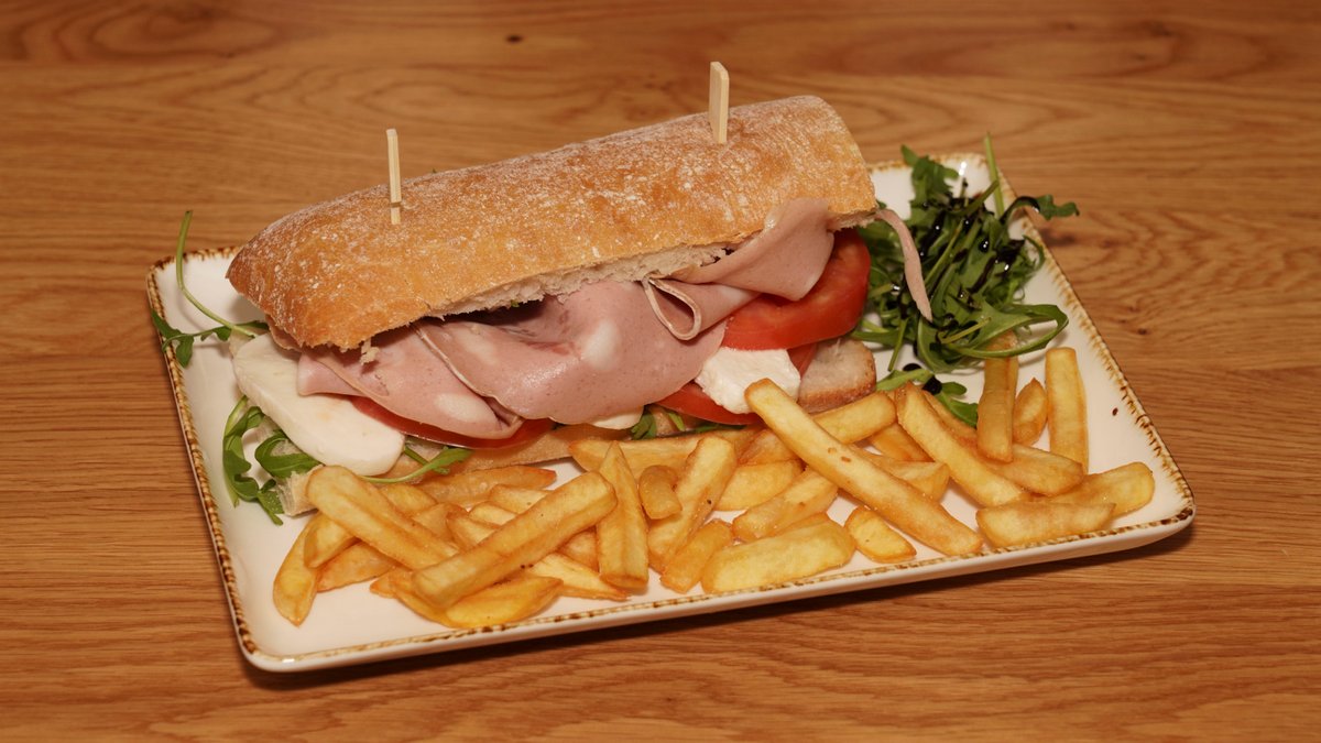 Baguette sa mortadelom, pestom, paradajzom, mozzarellom, rukolom i pomfritom