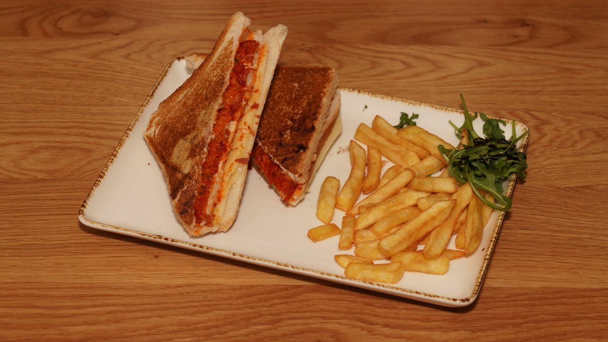 Tost hleb sa kulenom, kačkavaljem i ajvarom, uz prilog pomfrit