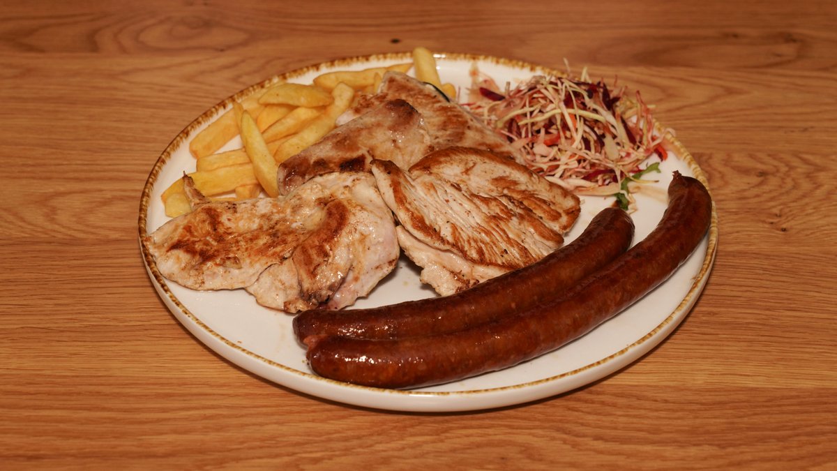 Laks kare 180g, pileći file 180g, kobasica 140g, vitaminska salata 50g i pomfrit 100g