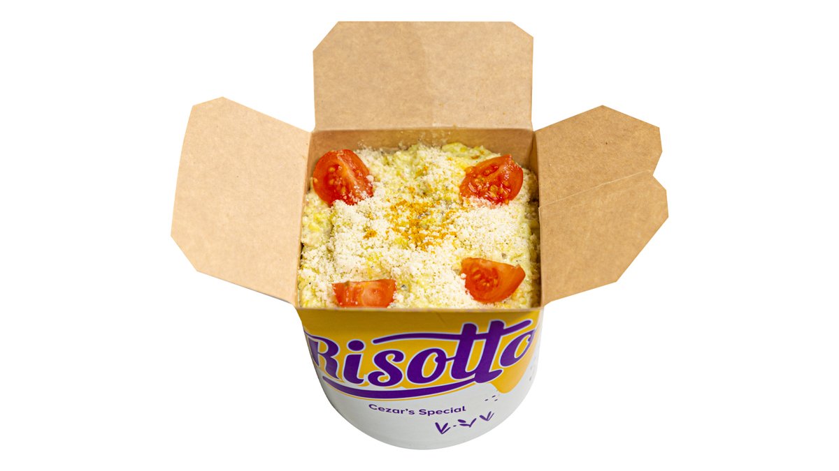 380g. Šampinjoni, dimljena piletina, začini, vino, pavlaka za kuvanje, bujon, gorgonzola, pirinač, maslac, čeri paradajz, parmezan