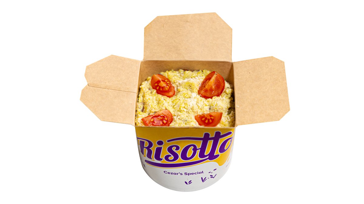 380g. Šampinjoni, dimljena piletina, začini, vino, pavlaka za kuvanje, bujon, gorgonzola, pirinač, maslac, čeri paradajz, parmezan