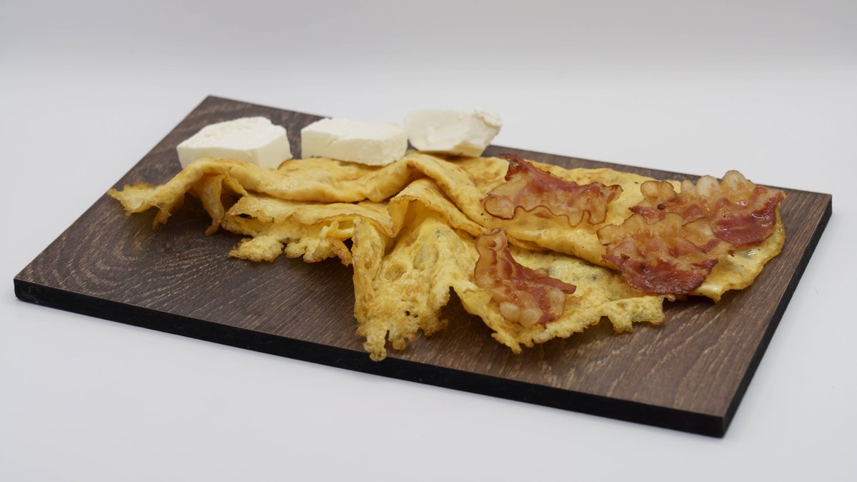 3 jaja, pečenica, kisela pavlaka, feta sir, zelena salata, paradajz, pomfrit