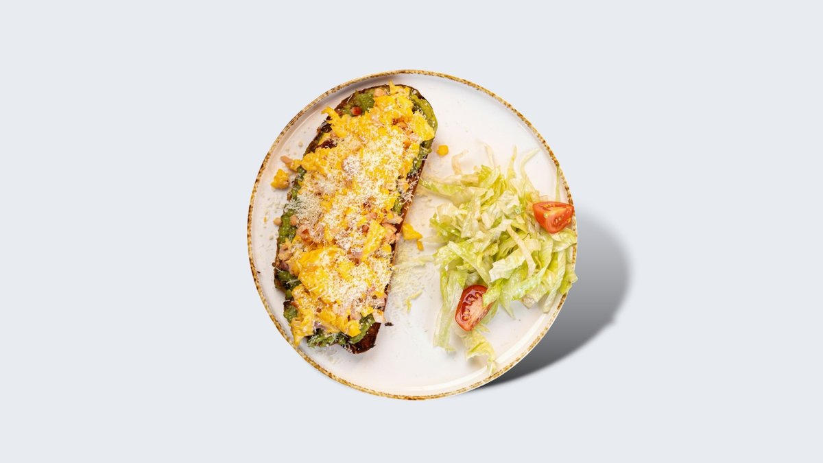 2 poširana jaja na zapečenom rustičnom hlebu sa avokado namazom, domćim sirom i kajen paprikom uz dodatak salate
