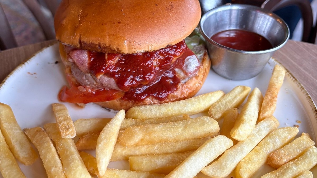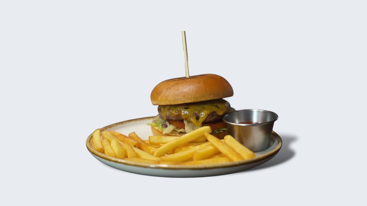 Burger zemička, 150g junećeg mesa, čedar sir, paradajz, kiseli krastavčići, ajsberg salata, burger sos, pomfrit, kečap