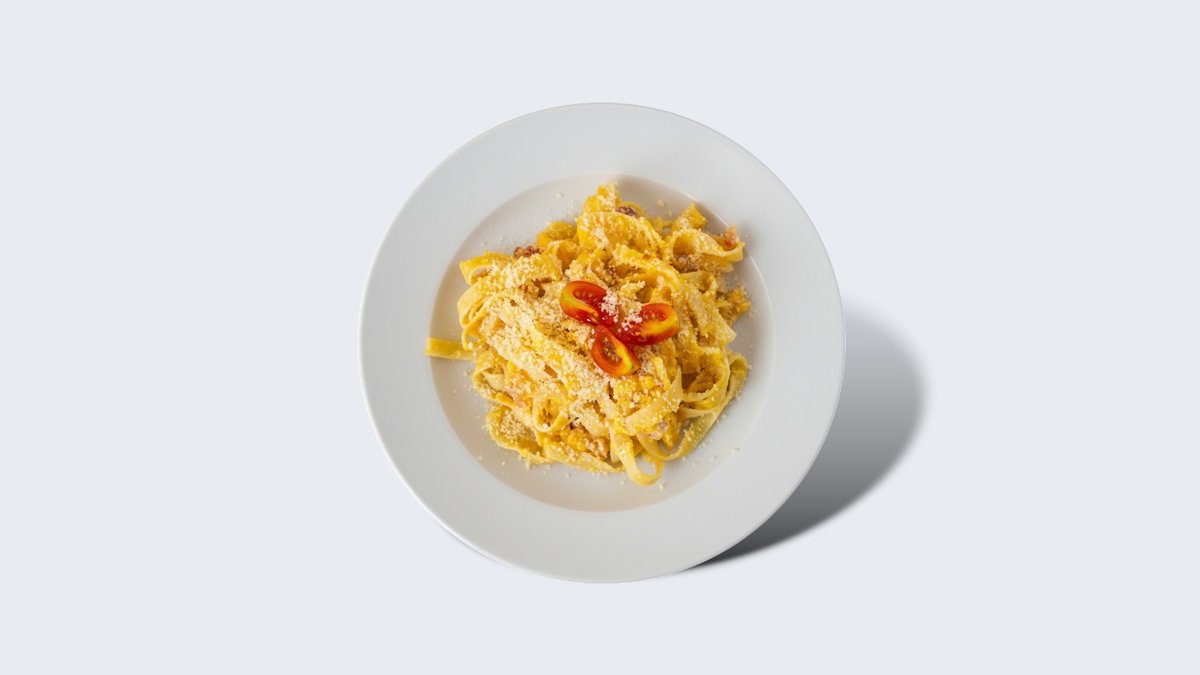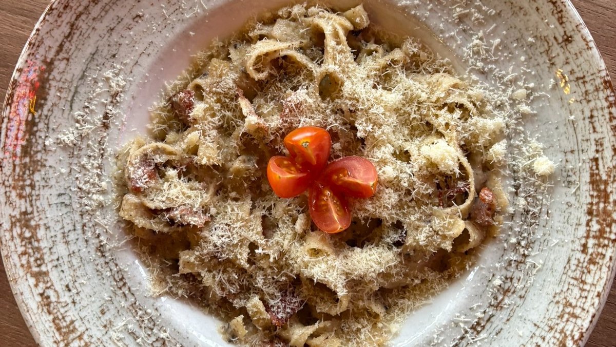 Taljatele, pršuta, salsa od tartufa, neutralna pavlaka, gorgonzola, parmezan, čeri paradajz, začini