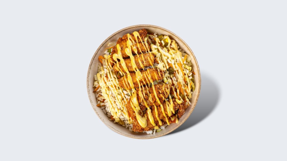 Pohovani pileći štapići, pirinač, paradajz, kiseli krastavčići, ajsberg salata, šargarepa, kukuruz, dresing