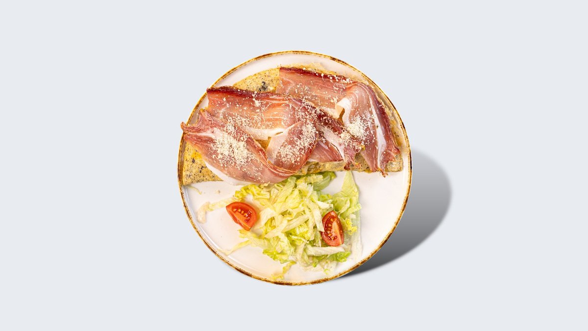 Omlet od 3 jaja sa šunkom, gaudom i domaćim namazom u toploj grilovanoj tortilji i salatom