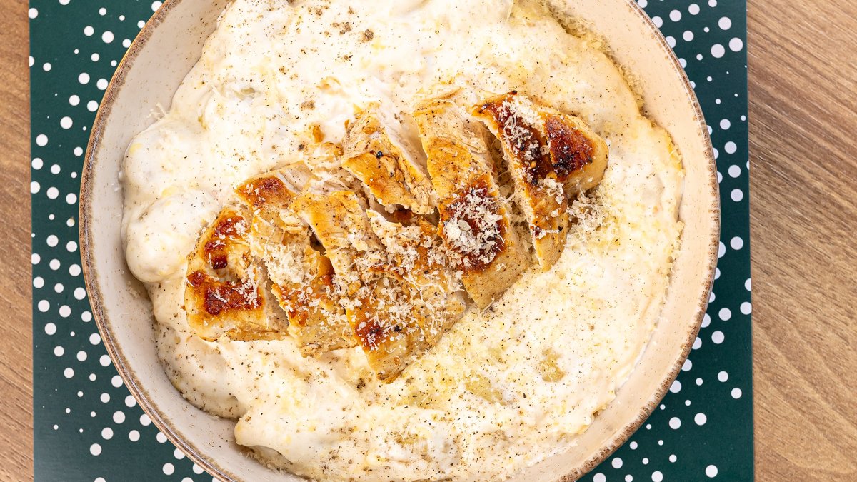 Njoke u belom sosu sa dodatkom grilovane piletine, mocarele, gorgonzole i parmezana