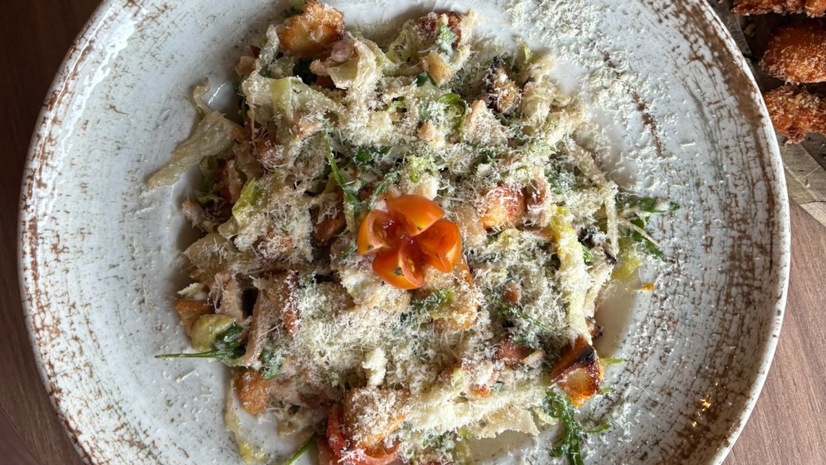 Miks zelenih salata, dimljena piletina, hrskava grilovana slanina, čeri paradajz, parmezan, krutoni i domaći dresing