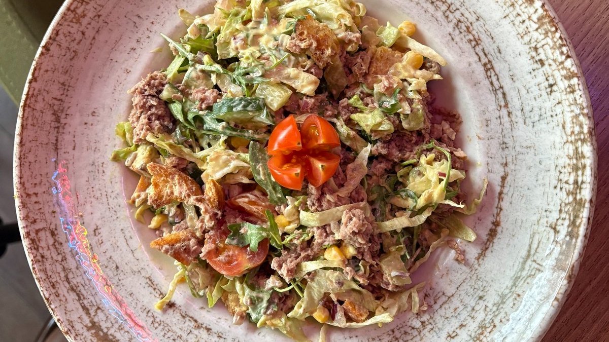 Tuna, krastavac, čeri paradajz, dresing od grčkog jogurta sa limunom, kukuruz, crveni luk, rukola, ajsberg, rustični hleb.