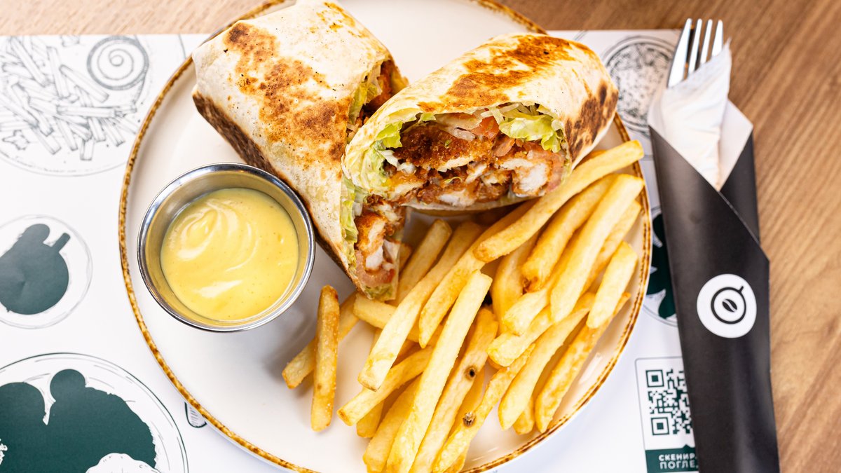 Zapečena tortilja sa domaćim namazom, pohovanim pilećim štapićima, čedarom, ajsberg salatom i svežim paradajzom, sa dodatkom pomfrita