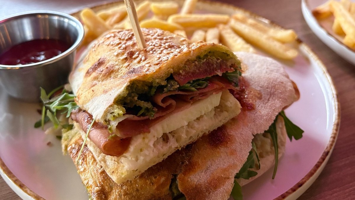 Hrskava čabata sa mocarelom, pesto sosom, grilovanom mortadelom, svežim paradajzom i rukolom uz dodatak pomfrita