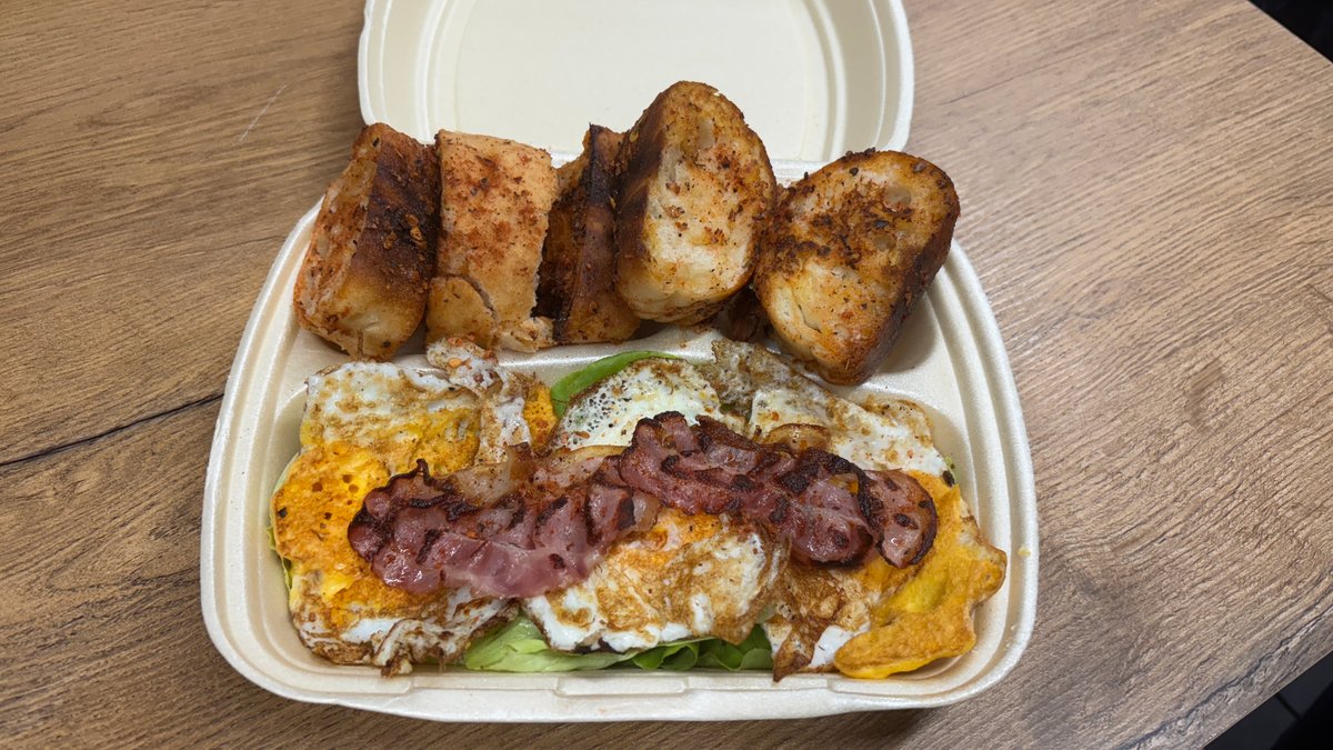 Tri jaja na oko, proprzena slaninica, gril kifla (albanska salata), zelena salata i prelivi