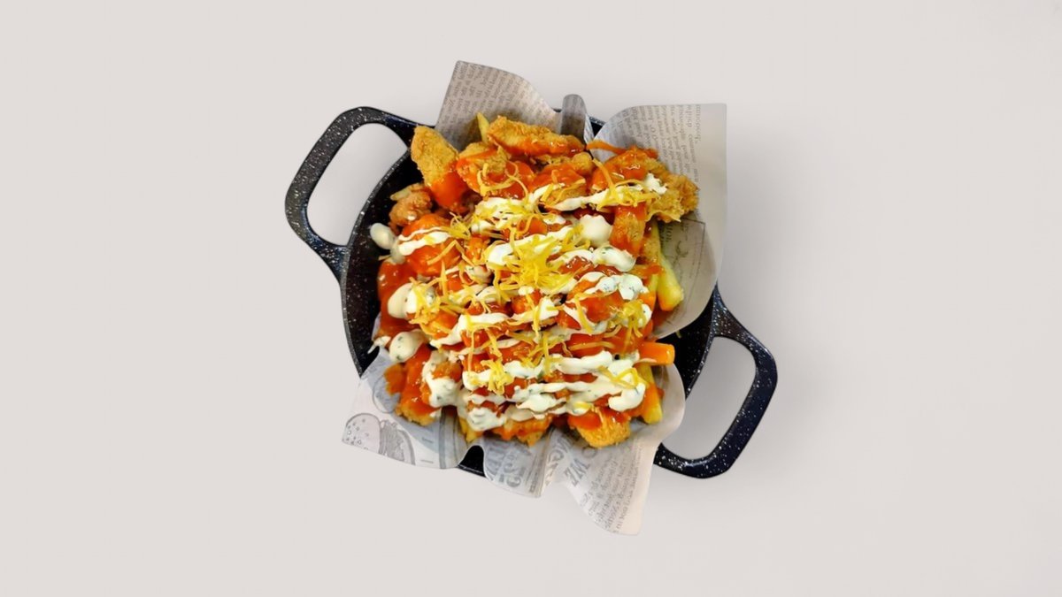 Pileće kokice, pomfrit, ranč sos, ljuti roštilj sos, čedar sir.