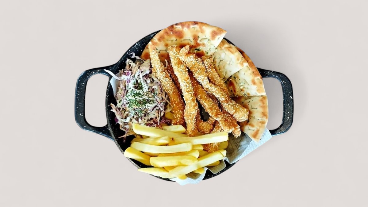 Štapići pilećeg filea u panko prezli i susamu sa pomfritom, kupus salatom i doručak sosom (20ml) uz lebac po izboru.