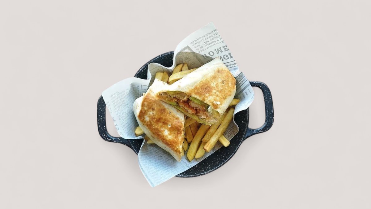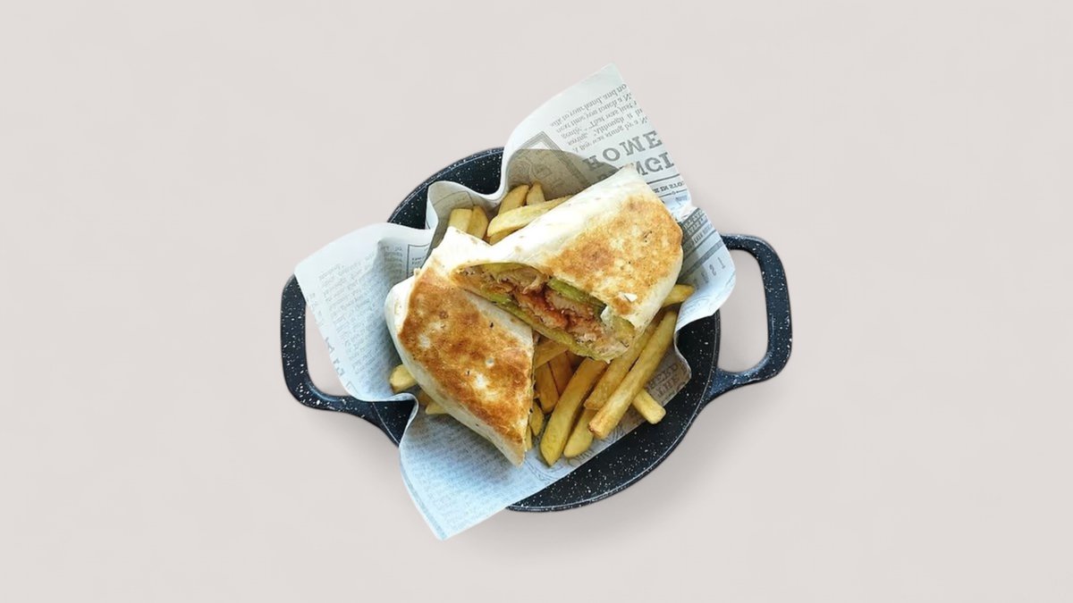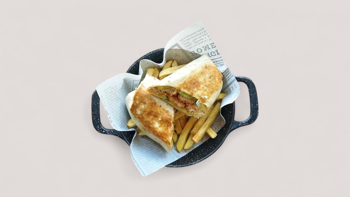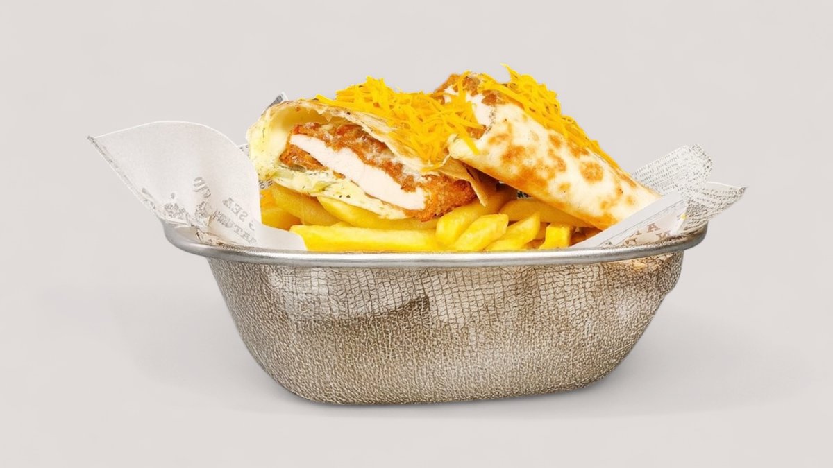 Komad pilećeg filea u našem hrskavom pohu, mix mocarele i čedar sira, krastavčići i sos po izboru u zapečenoj tortilji, pomfrit u prilogu.
