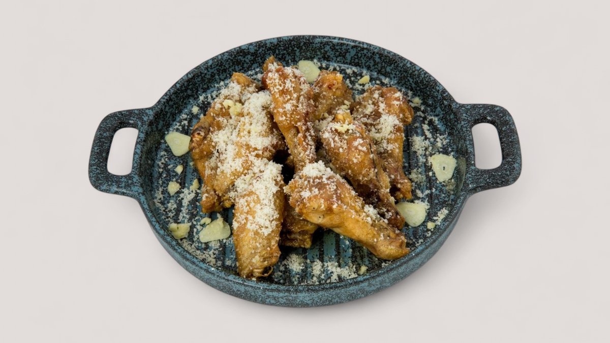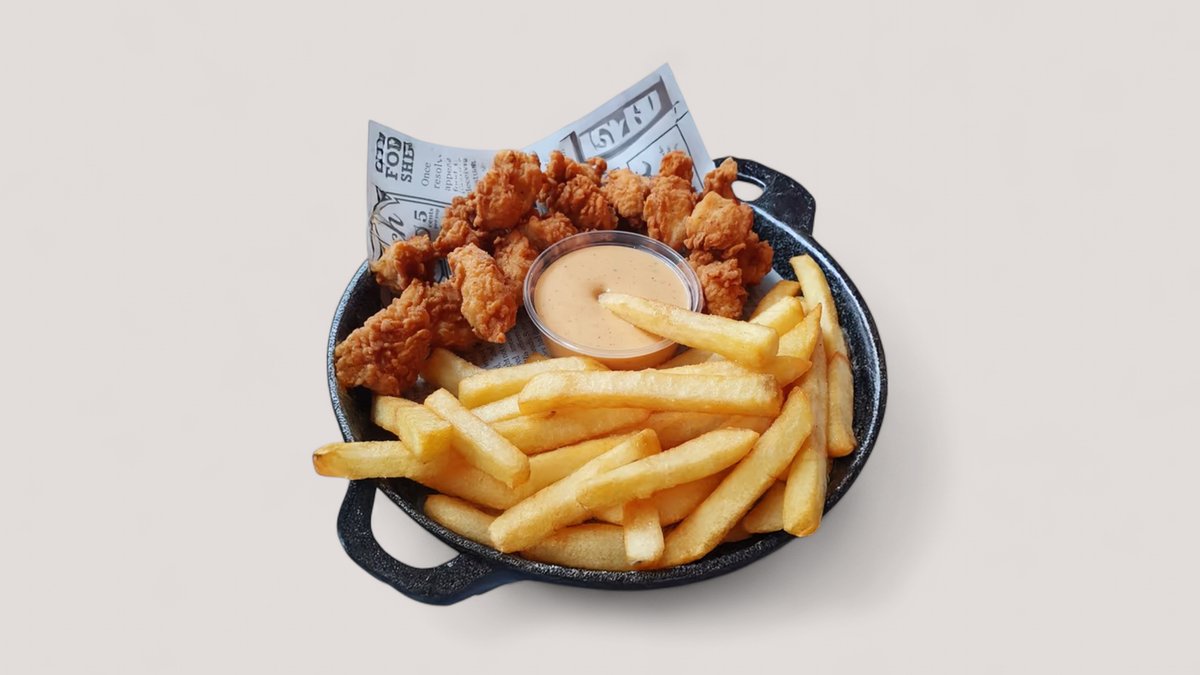Pileće kokice, pomfrit, limun-beli luk sos, parmezan.