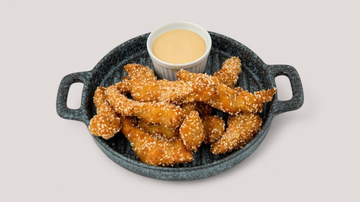 Štapići svežeg pilećeg filea u panko prezli i susamu (250g) sa limun-beli luk (20ml) sosem u prilogu.