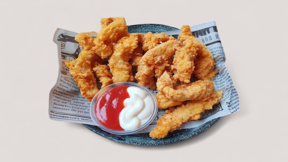 Hrskavi pileći štapići sa kačkavaljem, iceberg salatom, kiselim krastavčićima,ranč i bbq sosem u zapčenoj tortilj sa pomfritom u prilogu.