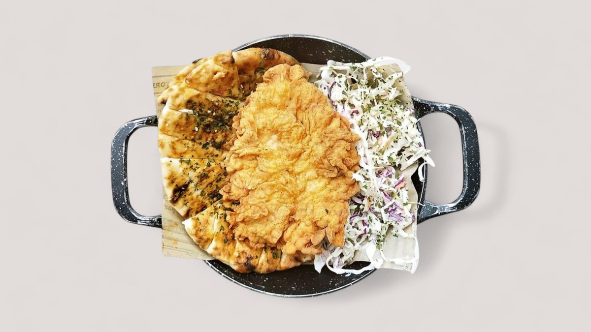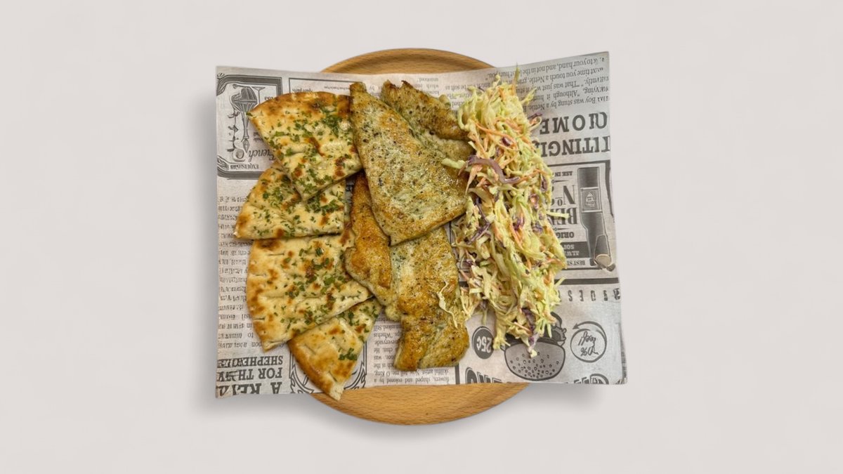 panirani pileći file sa kupus salatom, pomfritom i giros pitom