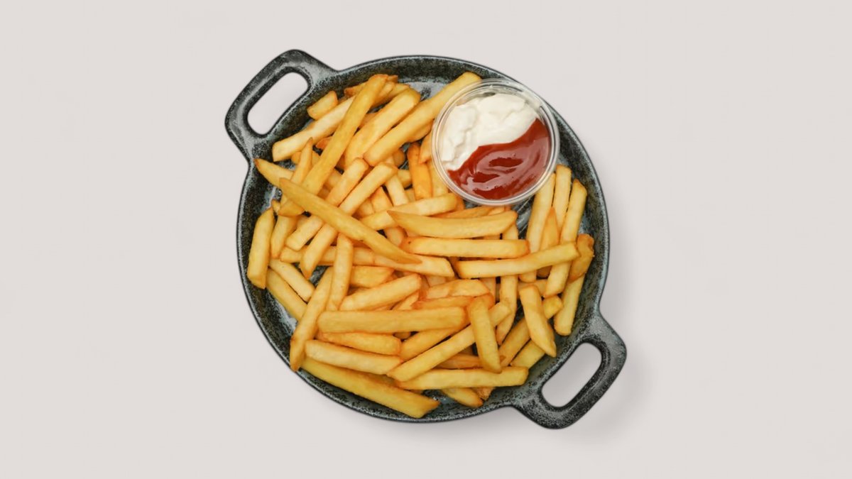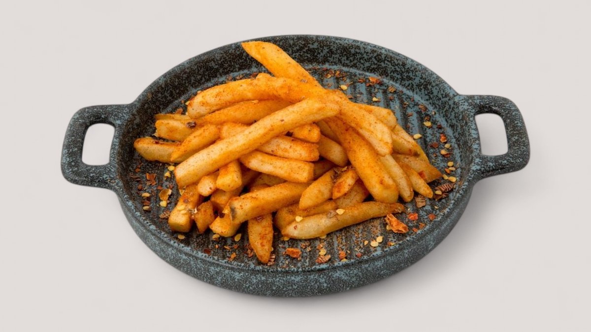 Pomfrit sa Merak ljutim mix začinom + kečap i majonez u prilogu.