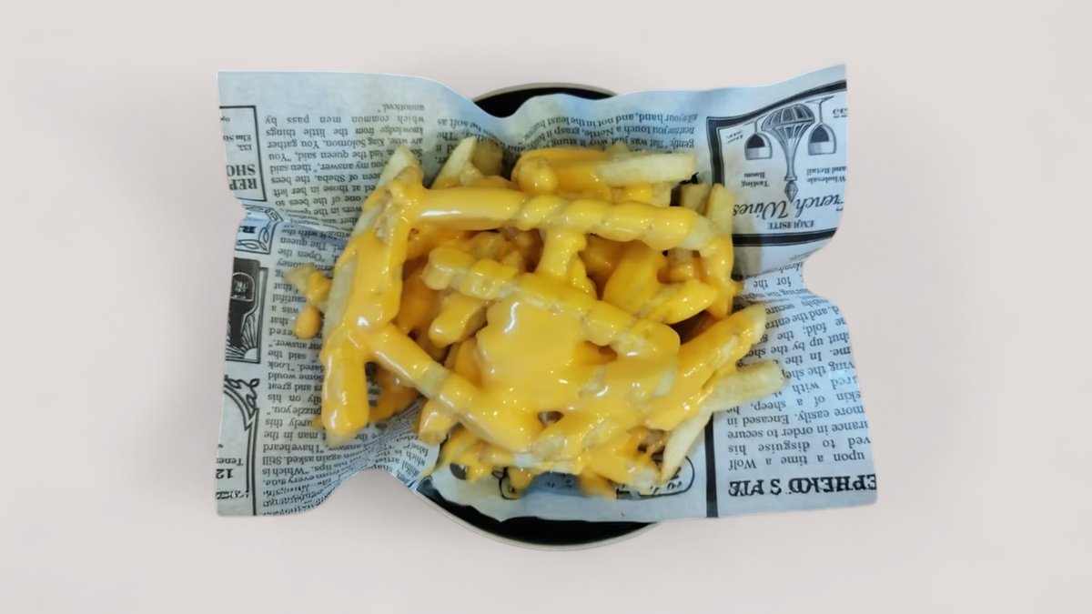 Pileće kokice, pomfrit, ranč sos, roštilj sos, čedar sir.