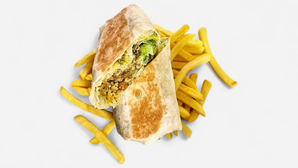 wrap od pšenične tortilje sa 8 falafel kuglica, domaćim humusom, iceberg salatom,kukuruz šećercem i krastavčićima, preliveno našim tahini sosom uz dodatak pomfrita