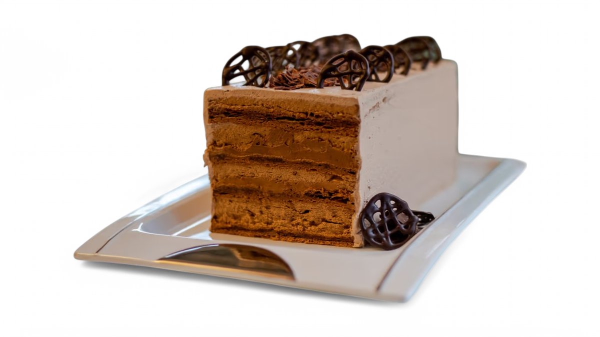7 - 10 parčeta. Čokoladni biskvit, krem od najfinije crne čokolade i krem od vanile, bogat seckanim lešnikom