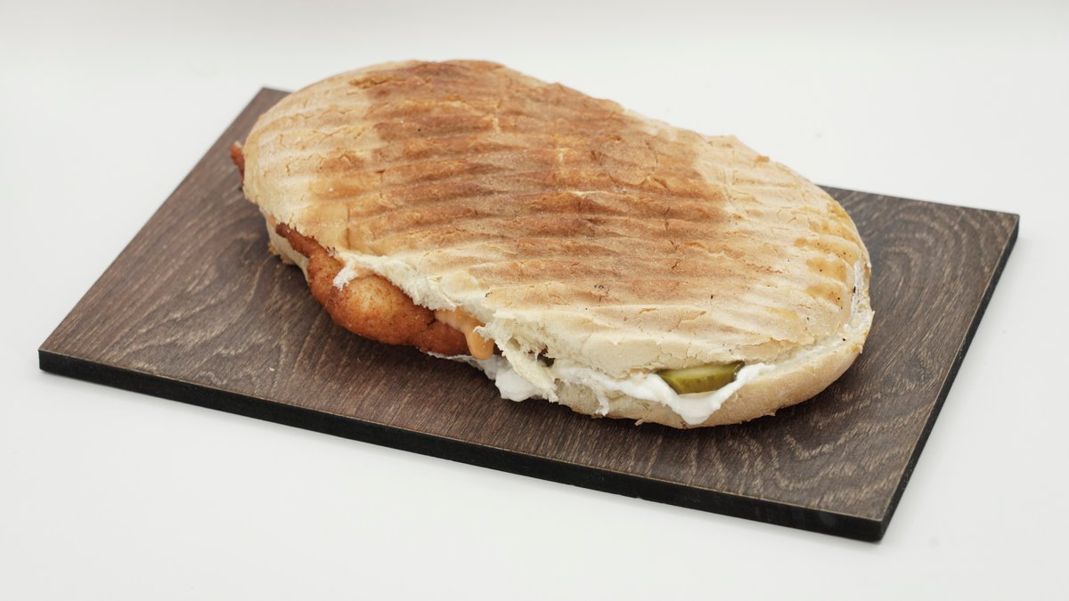 pohovana piletina 150g, burger sos, pavlaka, krastavčići, somun