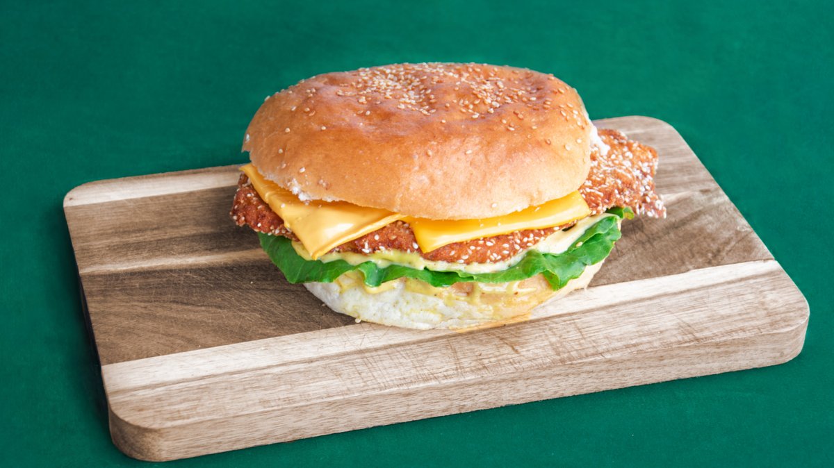 Pileći file, Čedar, Zelena Salata, Kiseli krastavčići, Senf-Med Sos, Lepinja