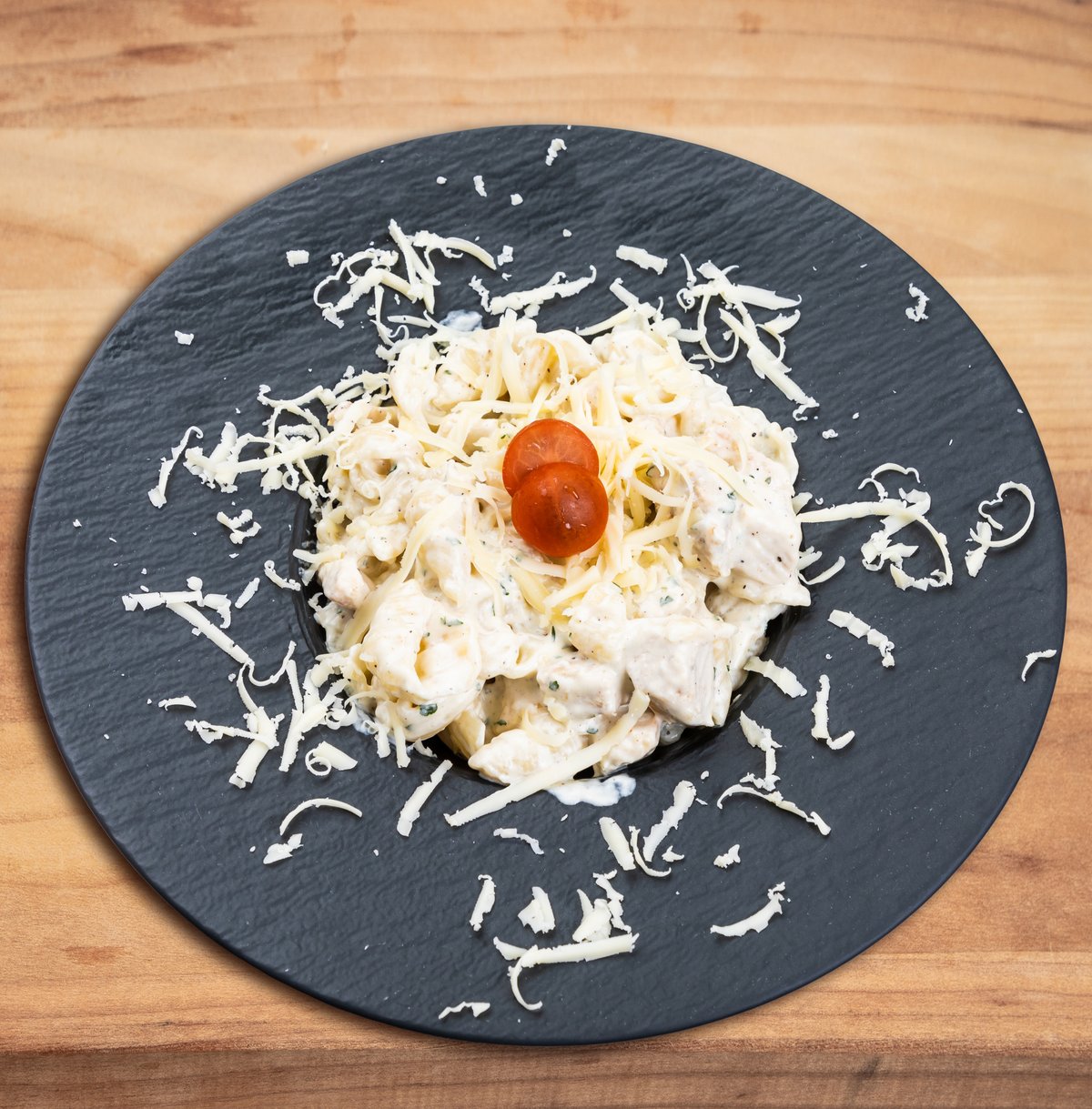 Sveža pasta,piletina,slanina,SVEŽ beli luk,pavlaka,spanać,začini,ulje,parmezan.