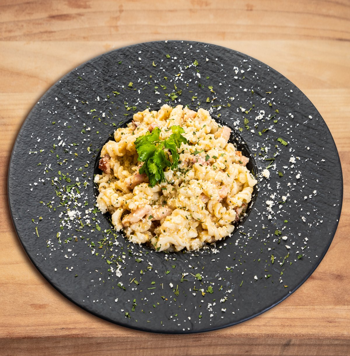 Sveža pasta,slanina,SVEŽ beli luk,pavlaka,spanać,začini,ulje,parmezan.