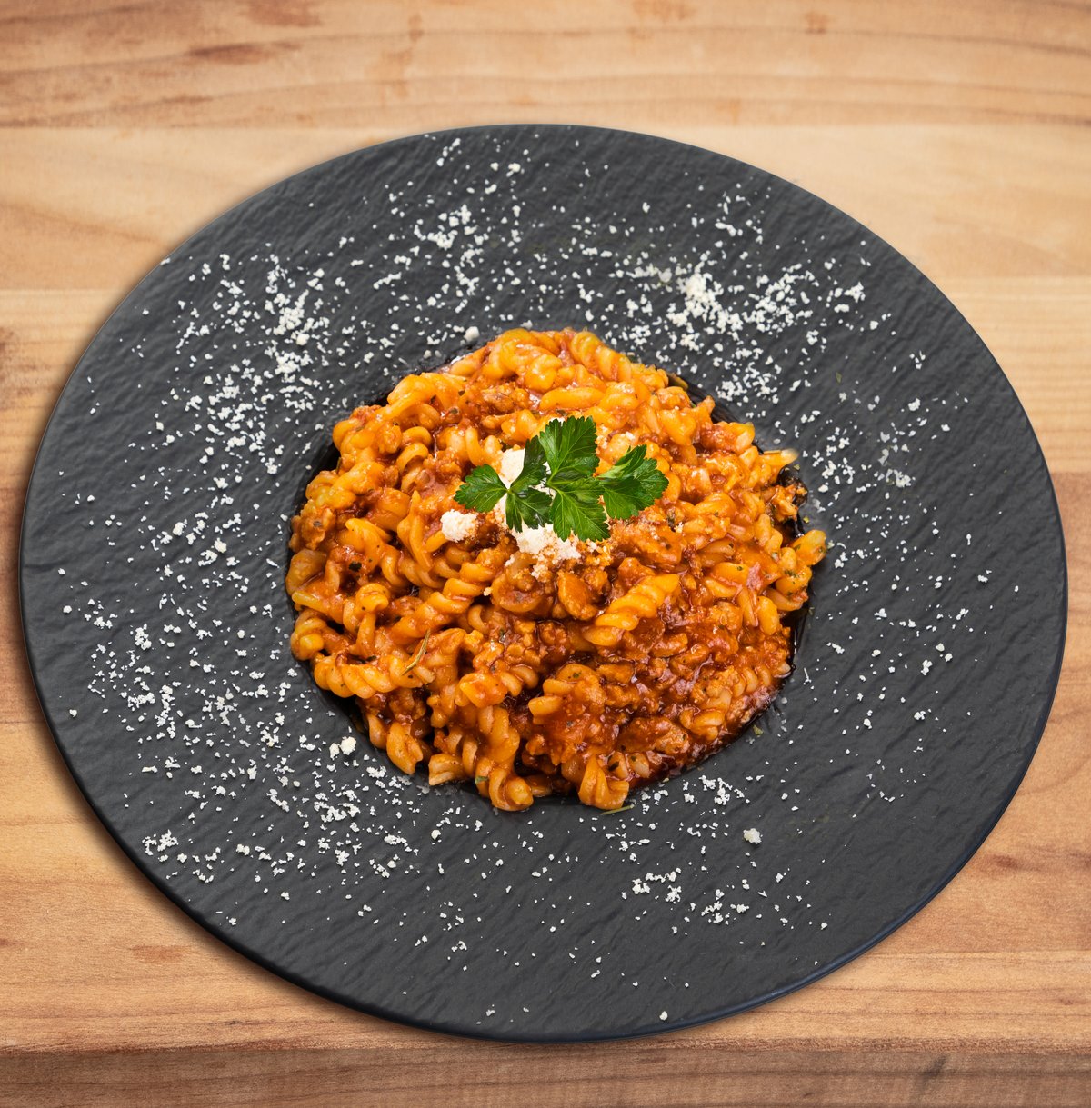 Paradajz sos, svinjsko mleveno meso, crni luk ,ekstradevičansko maslinovo ulje, parmesan