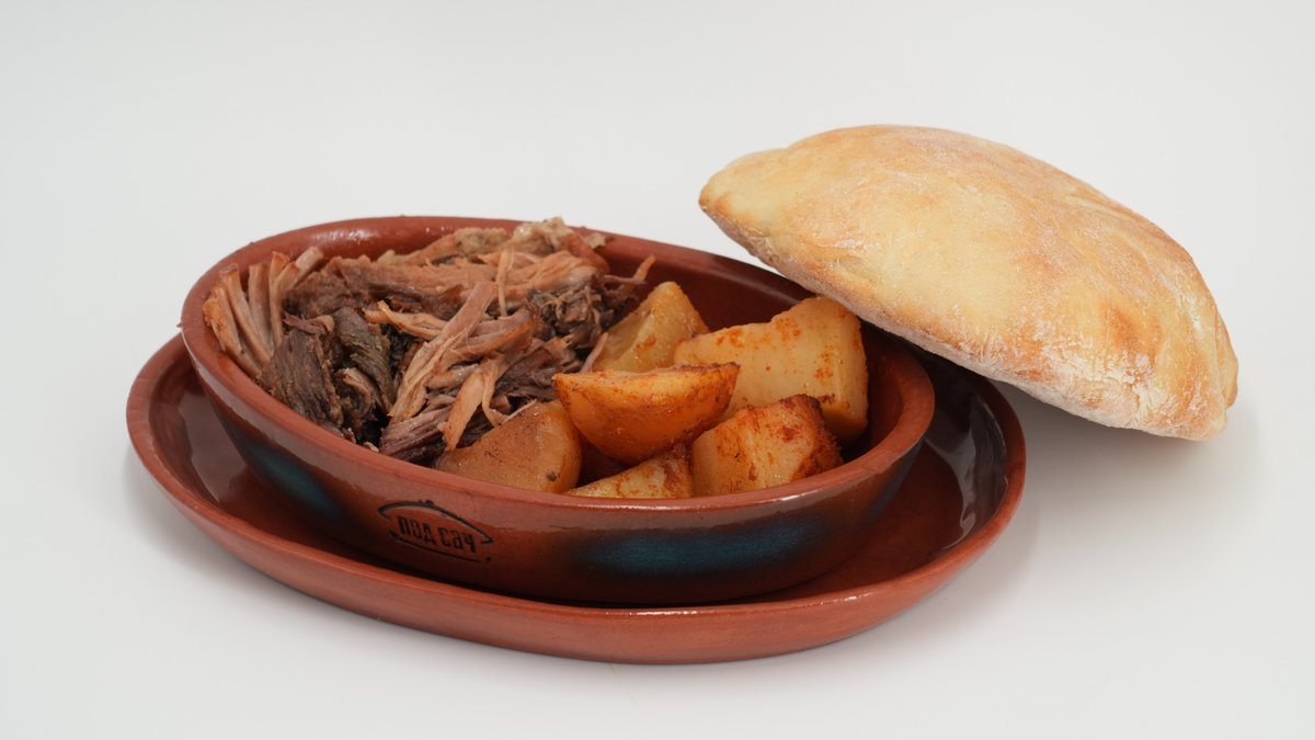 Sporo pečena svinjetina iz sača sa domaćim pekarskim krompirom i somunom. Sočno, mirisno i potpuno domaće — idealan ručak iz jedne posude. Ukus tradicije, spreman za poneti. 200g svinjetina + pekarski krompir 200g + somun 130g Svinjetina bez kosti marinirana jedan dan , spremana u zemljanoj posudi 4 sata na tihoj vatri ostavlja Vas bez reci